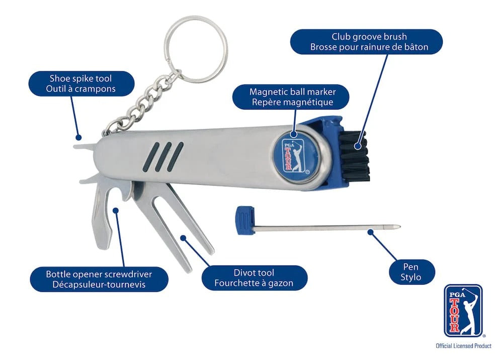 The PGA TOUR Golf Multi Tool is a compact, all-in-one accessory designed to keep you prepared on the course. Combining essential repair and marking functions in one convenient tool, it’s a must-have addition to any golfer’s pocket or bag.